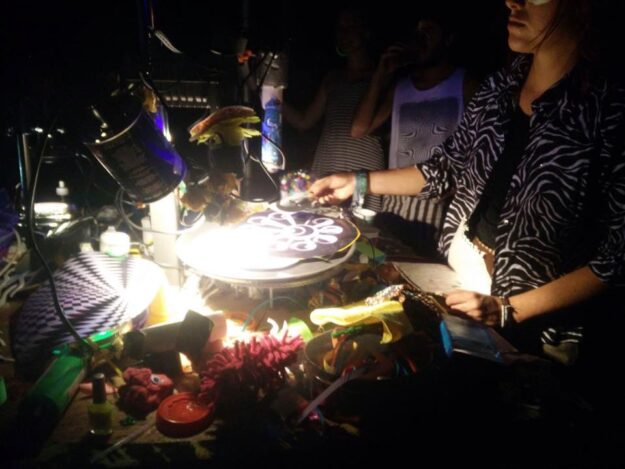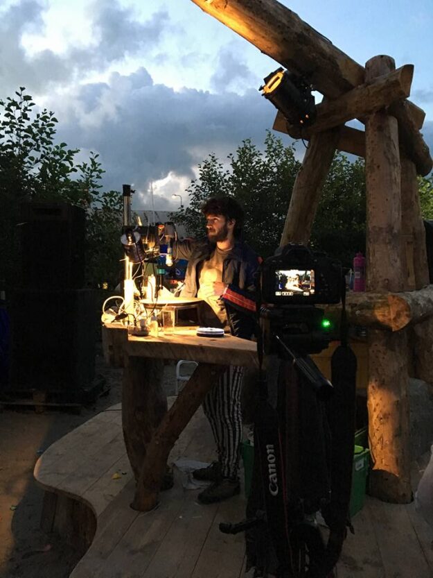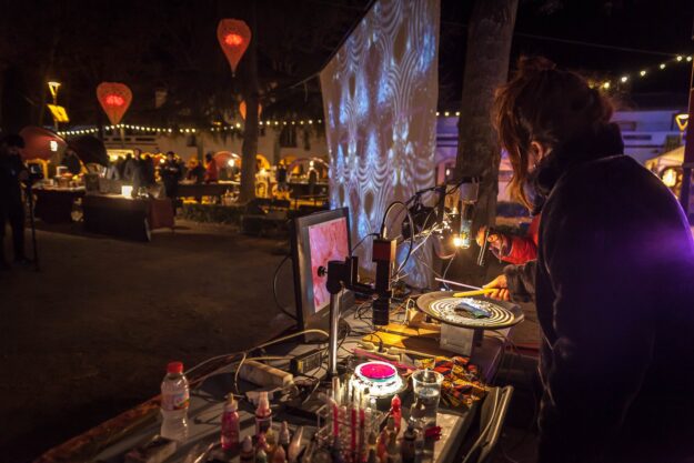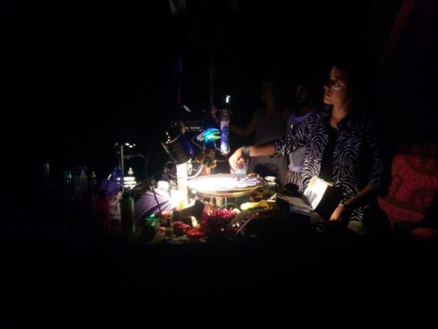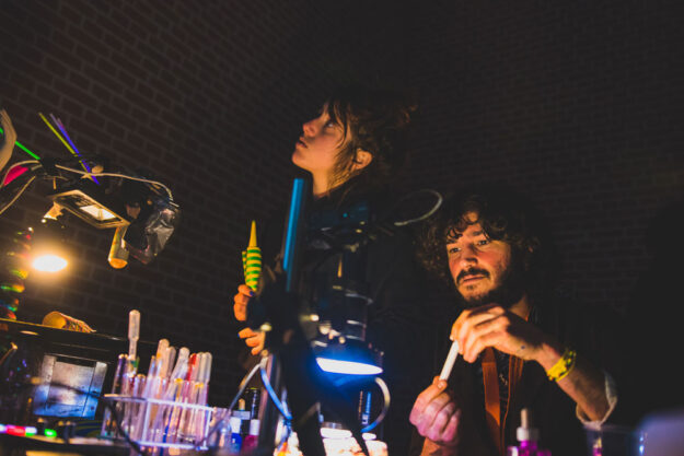 This show aims to create an unique experience to the audience, who can see how the visuals are being created live, just in front of their eyes, in coordination with the music that it’s being performed. An experience that transform the stage in a universe of projections with flowing liquids looking like galaxies or planets surfaces and geometrical turning compositions dancing together with the music.